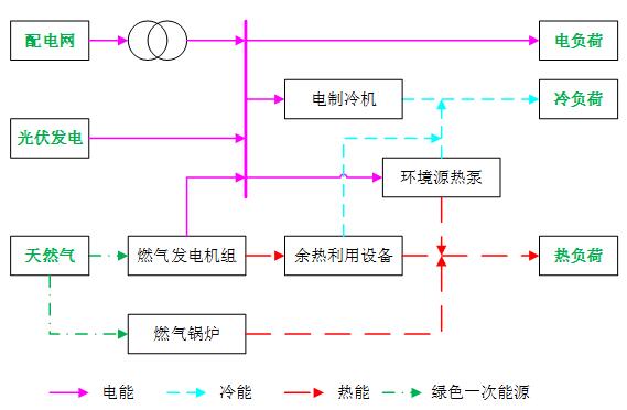 根據(jù)用戶(hù)各種負(fù)荷的時(shí)空變化特征,因地制宜,天然氣、太陽(yáng)能、環(huán)境熱能等多能互補(bǔ),按照“科學(xué)用能、系統(tǒng)優(yōu)化、溫度對(duì)口、梯級(jí)利用”的思想,高效集成、優(yōu)化配置,能源就地平衡,遵循電能自發(fā)自用、余熱利用最大化的原則,以CCHP滿(mǎn)足較連續(xù)穩(wěn)定的基本負(fù)荷,通過(guò)調(diào)峰設(shè)備滿(mǎn)足最大負(fù)荷需求,最大限度發(fā)揮CCHP滿(mǎn)負(fù)荷高效運(yùn)行的經(jīng)濟(jì)潛力,冷熱電全部在經(jīng)濟(jì)合理的范圍內(nèi)就地直供,全面優(yōu)化一次能源轉(zhuǎn)換傳遞全過(guò)程,提高能源的梯級(jí)利用和轉(zhuǎn)換效率,有序構(gòu)建綠色、低碳、安全、高效、經(jīng)濟(jì)的并網(wǎng)型能源微網(wǎng)。