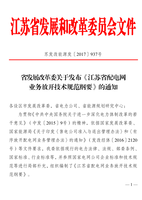 8月份,江蘇省發(fā)改委下發(fā)了《江蘇省增量配電業(yè)務(wù)改革試點實施細(xì)則》,其中強調(diào)“為保障增量配電網(wǎng)用戶安全、可靠、穩(wěn)定用電,與增量配電業(yè)務(wù)相關(guān)的規(guī)劃、工程設(shè)計、設(shè)備運維、調(diào)度運行、客戶服務(wù)、供電安全等方面工作均應(yīng)依據(jù)《江蘇省增量配電業(yè)務(wù)技術(shù)標(biāo)準(zhǔn)體系》(另行編制發(fā)布)等開展。”這是第一個針對增量配電網(wǎng)提出技術(shù)規(guī)范要求的省級文件。