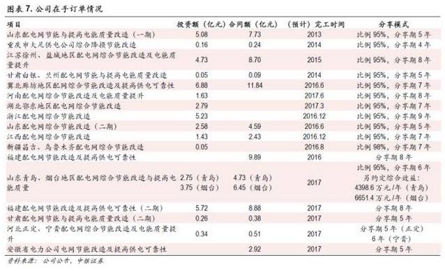 配電網(wǎng)節(jié)能業(yè)務(wù)訂單儲(chǔ)備充足:公司收購的國網(wǎng)配電網(wǎng)節(jié)能業(yè)務(wù)自2013年開展以來,收入呈快速增長趨勢(shì),合同額從第一年的8億元躍升至2015年的近30億元,累計(jì)簽署合同額超過60億元。2016年下半年,公司連續(xù)簽訂福建二期、甘肅二期、河北、山東青島、煙臺(tái)、安徽等多個(gè)配電網(wǎng)節(jié)能項(xiàng)目合同,總額約24億元。加上此前簽訂的訂單,公司目前處于節(jié)能分享期的訂單總額約為45億元,預(yù)計(jì)2017年部分項(xiàng)目完工投產(chǎn)后,分享期訂單額將達(dá)到75億元左右,年凈利潤約為1.5億元。