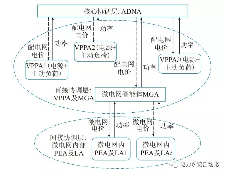 在此背景下,主動(dòng)配電網(wǎng)多智能體系統(tǒng)包含核心協(xié)調(diào)層(ADNA)、直接協(xié)調(diào)層(VPPA與MGA)、間接協(xié)調(diào)層(微網(wǎng)內(nèi)PEAs、LAs),如圖2所示。處于上層的智能體對下層進(jìn)行電價(jià)激勵(lì),處于下層的智能體對上層電價(jià)進(jìn)行功率響應(yīng),這一多層電價(jià)響應(yīng)機(jī)制保證了不同層級智能體間利益協(xié)調(diào)的有序進(jìn)行,原理類似于有序的多層規(guī)劃。