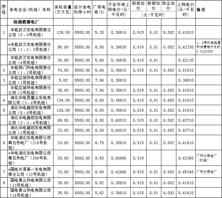 湖北省燃煤發(fā)電企業(yè)上網(wǎng)電價表(2017年7月1日起執(zhí)行)