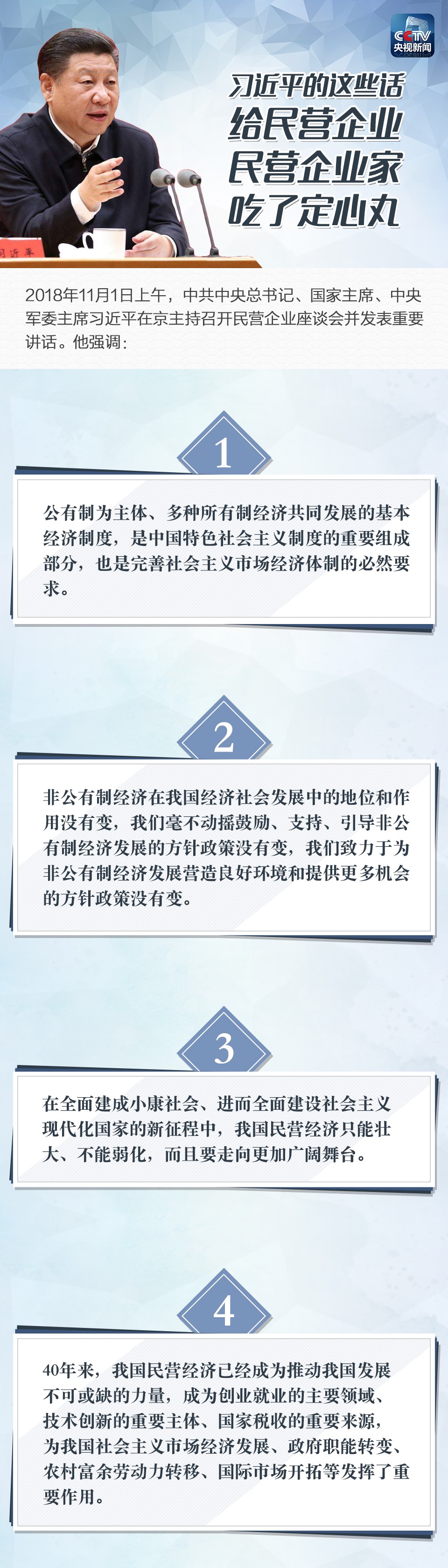 中共中央總書記、國(guó)家主席、中央軍委主席習(xí)近平11月1日上午在京主持召開民營(yíng)企業(yè)座談會(huì)并發(fā)表重要講話。習(xí)總書記對(duì)民營(yíng)經(jīng)濟(jì)發(fā)展都作出了哪些重要論述?