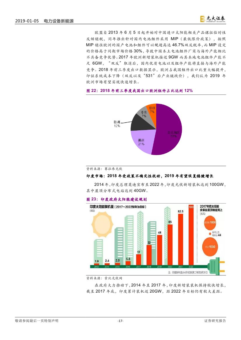 2017 年光伏制造行業(yè)大規(guī)模擴產(chǎn),新增產(chǎn)能于 2018/2019 年陸續(xù)投 放造成供過于求,具備成本優(yōu)勢和技術路線優(yōu)勢的企業(yè)將勝出。2019 年 16 個 GW 級光伏市場有望出現(xiàn),海外市場實現(xiàn)持續(xù)快速增長。我們認為積 極布局海外市場的企業(yè)將有效規(guī)避單一市場波動帶來的風險。