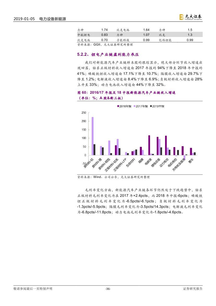 預計 2019 年新能源汽車銷量約 160 萬輛(同比增長 30%+)。但車 型結構方面,符合市場需求的新能源乘用車車型增多,消費結構也有望逐 步優(yōu)化。展望 2019 年,(1)動力電池環(huán)節(jié),成本端的壓力有望緩解,寧 德時代對上下游依然有較大議價能力;(2)鋰電材料環(huán)節(jié),依然面臨價格 下調的壓力,靜待調整。我們認為,新能源汽車產(chǎn)業(yè)鏈全球化競爭是下一 階段重點關注的方向。(1)國內動力電池龍頭有望憑借性價比優(yōu)勢、服務 優(yōu)勢出海拿下更多訂單;(2)鋰電材料環(huán)節(jié)也將受益于海外電池廠國產(chǎn)化。