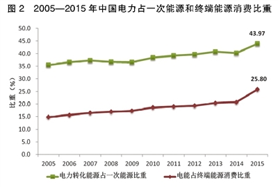 當(dāng)前我國(guó)與發(fā)達(dá)國(guó)家電能在終端能源消費(fèi)中的比重持平,且我國(guó)還略高于英國(guó)等發(fā)達(dá)國(guó)家。這種現(xiàn)象使一些專家認(rèn)為,我國(guó)電能占終端能源比重不會(huì)再提高。筆者認(rèn)為,發(fā)達(dá)國(guó)家天然氣在終端能源消費(fèi)中的比重約為25%,而我國(guó)在7%左右,我國(guó)計(jì)劃在2020年力爭(zhēng)達(dá)到10%,2030年達(dá)到15%左右。制約天然氣發(fā)展的主要因素是資源、價(jià)格以及相對(duì)于可再生能源碳排放仍然較高的特性。要提高我國(guó)終端能源消費(fèi)的清潔化,需要同步提高可再生能源發(fā)電比重及電能在終端能源消費(fèi)中的比重(見圖2)。