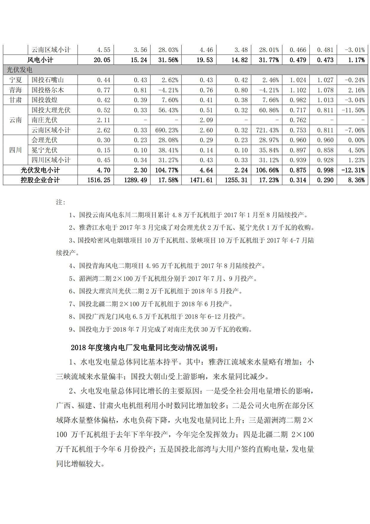 2018年度境內(nèi)電廠發(fā)電量同比變動(dòng)情況說明: