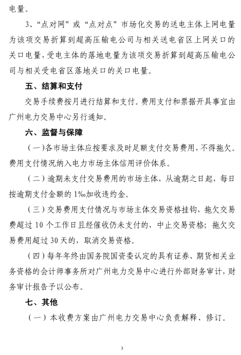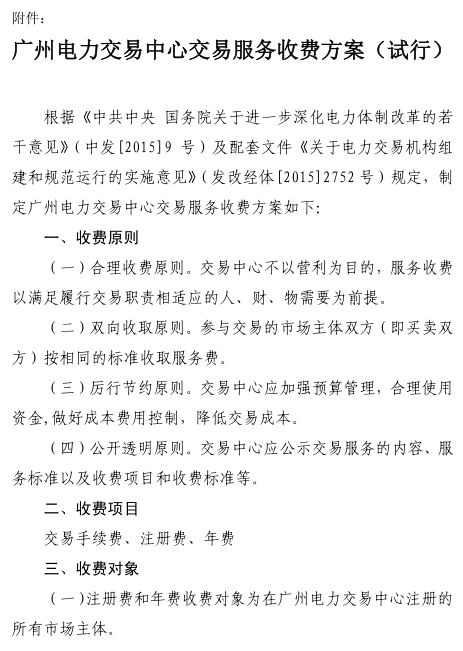 根據(jù)《中共中央 國務(wù)院關(guān)于進一步深化電力體制改革的若干意見》(中發(fā)[2015]9號)及配套文件《關(guān)于電力交易機構(gòu)組建和規(guī)范運行的實施意見》(發(fā)改經(jīng)體[2015]2752號),《廣州電力交易中心交易服務(wù)收費方案(試行)》(詳見附件)經(jīng)廣州電力交易中心市場管理委員會審議通過,并已經(jīng)上報政府主管部門。從2017年6月1日起實施收費。