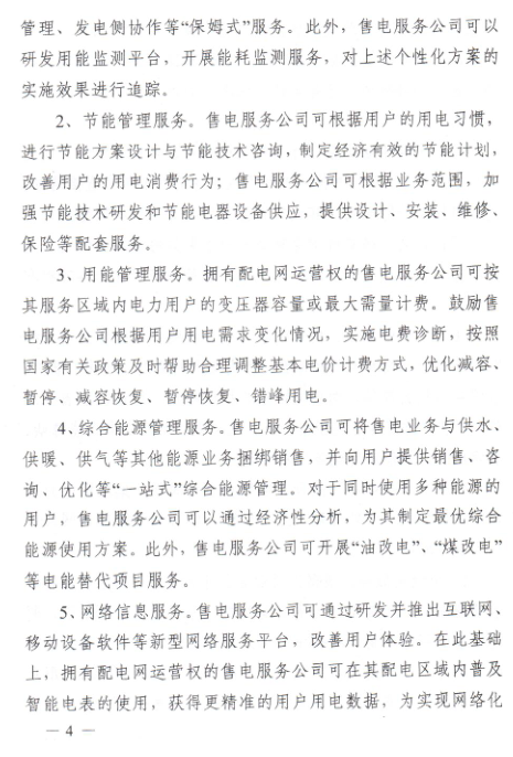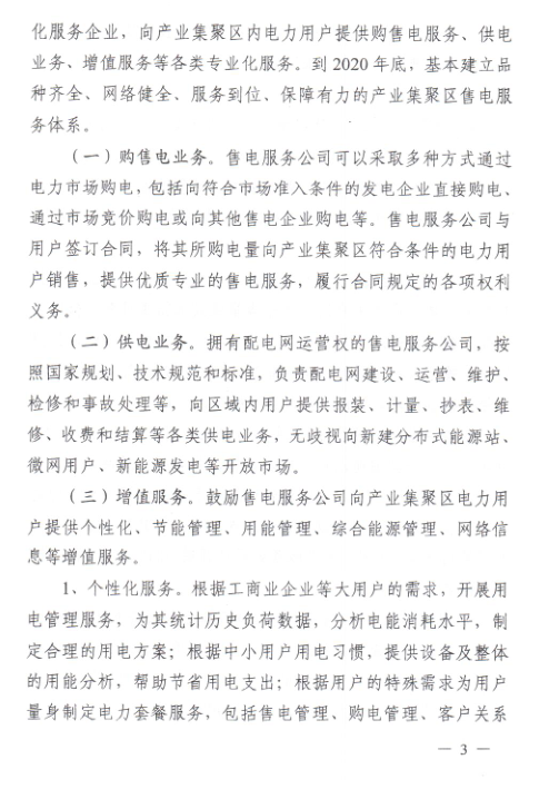 支持售電服務(wù)公司拓展服務(wù)范圍,鼓勵售電公司作為電力市場專業(yè)化服務(wù)企業(yè),向產(chǎn)業(yè)集聚區(qū)內(nèi)電力用戶提供購售電服務(wù)、供電業(yè)務(wù)、增值服務(wù)等各類專業(yè)化服務(wù)。到2020年底,基本建立品種齊全、網(wǎng)絡(luò)健全、服務(wù)到位、保障有力的產(chǎn)業(yè)集聚區(qū)售電服務(wù)體系。