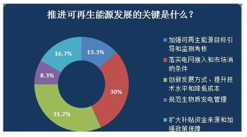 在調(diào)查中,認(rèn)為推動(dòng)可再生能源關(guān)鍵在于落實(shí)電網(wǎng)接入和市場(chǎng)消納條件的占受訪者的30%。