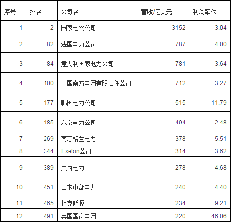 《財富》2017年世界500強中12家電網(wǎng)企業(yè)共完成營收8105億美元,實現(xiàn)利潤431億美元,利潤率為5.31%(規(guī)模最小的英國國家電網(wǎng)利潤應(yīng)該不正常,利潤率達46%位居500強第一,其他11家的平均利潤率為4.18%)。國家電網(wǎng)以3152億美元的營收高居500強第2位,利潤率為3%,位居500強第286位,在12家電網(wǎng)企業(yè)中居倒數(shù)第2位。南方電網(wǎng)營收為712億美元,居500強第100位,居12家電網(wǎng)企業(yè)第4位,利潤率為3.3%,位居500強第274位,在12家電網(wǎng)企業(yè)中居倒數(shù)第3位。中國的2大電網(wǎng)在全球電網(wǎng)企業(yè)中規(guī)模居前,但贏利能力不強。