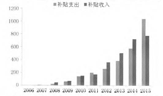 由上述計(jì)算結(jié)果可以看出雖然自備電廠一定程度上造成了征收不足,但并不足以造成700億元的巨額補(bǔ)貼缺口。造成補(bǔ)貼缺口的根本原因還是征收標(biāo)準(zhǔn)沒(méi)有滿足日益擴(kuò)大的補(bǔ)貼需求。南網(wǎng)科學(xué)研究院傅薔和王玲在《可再生能源電價(jià)附加的收支平衡分析》一文中,對(duì)2006年至2015年附加收入與支出做了測(cè)算: