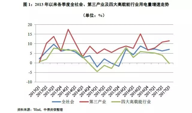 需求方面,由于工業(yè)景氣度回暖及高溫提前到來,前三季度全社會用電量46,888億千瓦時,同比增長6.9%,增速同比提高了2.4個百分點。其中,第三產(chǎn)業(yè)用電量2017年前三季度同比增長10.5%;四大高載能行業(yè)用電量增速4.9%,同比提高6.8個百分點。