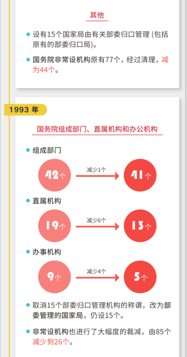 到1993年,國(guó)務(wù)院工作部門又增加至86個(gè),于是啟動(dòng)了第三次改革。經(jīng)過(guò)調(diào)整,國(guó)務(wù)院組成部門調(diào)整為41個(gè),直屬機(jī)構(gòu)調(diào)整為13個(gè),辦事機(jī)構(gòu)調(diào)整為5個(gè)。