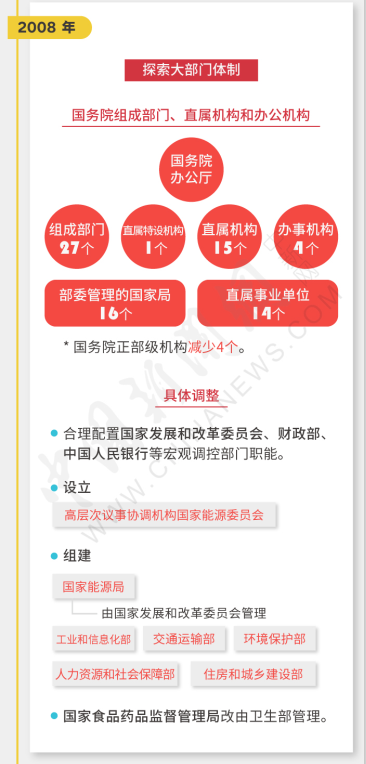 第六次改革于2008年啟動(dòng),主要任務(wù)是,圍繞轉(zhuǎn)變政府職能和理順部門職責(zé)關(guān)系,探索實(shí)行職能有機(jī)統(tǒng)一的大部門體制。