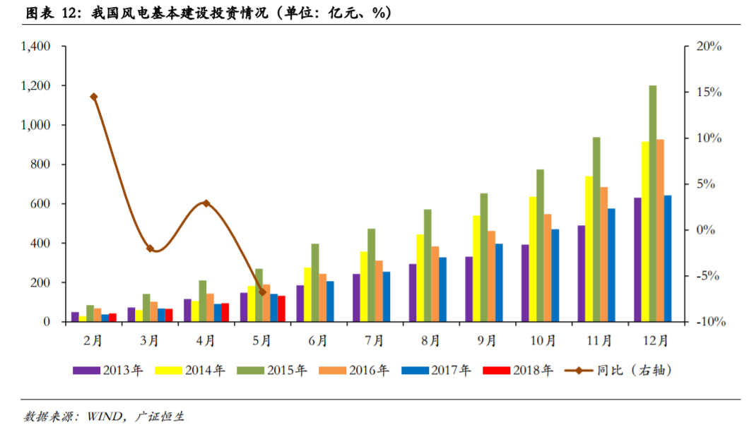 2018 年,我國每月風電基本建設(shè)投資額同比增幅呈波動下降趨勢,5 月風電基本建設(shè)投資額同比下降 6.78%。5 月“競價”政策出臺使風電行業(yè)承壓,我們認為,6 月在持續(xù)受到政策影響的條件下,6 月風電基本建設(shè)投資相較于 5 月在總量上可能會有所增加,但同比增幅可能依然為負。