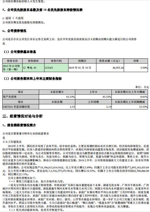 粵水電發(fā)布2018年半年度報(bào)告,報(bào)告顯示:報(bào)告期內(nèi),公司實(shí)現(xiàn)總資產(chǎn)18,196,813,414.54元,比上年度末增長3.89%;歸屬于上市公司股東的凈資產(chǎn)2,893,163,435.69 元,比上年度末增長0.87%;營業(yè)總收入3,316,377,472.98元,同比增長10.33%;歸屬于上市公司股東的凈利潤62,788,066.00 元,同比增長22.11%。