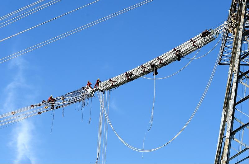 【背景】施工人員在錫盟—泰州±800千伏直流特高壓工程蘇2標段N6997號轉角塔安裝絕緣子?! ∵B日來,在錫盟—泰州±800千伏直