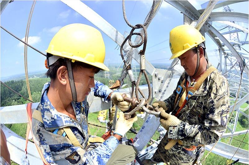 江蘇省送變電公司人員在±800千伏晉蘇線直流特高壓N3434鐵塔上緊固導(dǎo)線,全力投入國家大氣污染防治工程建設(shè)。