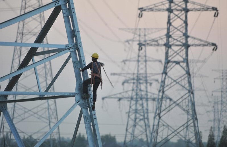施工人員正在江蘇揚州市瓜州鎮(zhèn)境內(nèi)新建的220千伏蔣橫線上組立塔。當日,揚州500千伏儀征變電站送出工程的2回220千伏迎峰度夏輸電線路建設全部進入施工高潮,江蘇省電力公司組織多路施工隊伍進場施工確保迎峰度夏工程工期。