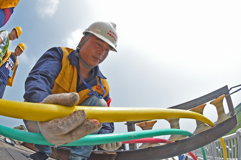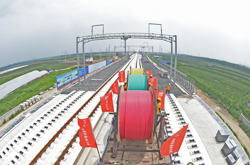 7月18日,中鐵電氣化局工程技術(shù)人員在敷設(shè)電力高壓電纜。當(dāng)日,在京沈高鐵遼寧段沈陽(yáng)西站至 新民北站區(qū)間,中鐵電氣化局工程技術(shù)人員開始敷設(shè)電力高壓電纜。電力高壓電纜敷設(shè)屬于高鐵建設(shè)電氣化施工的關(guān)鍵環(huán)節(jié),