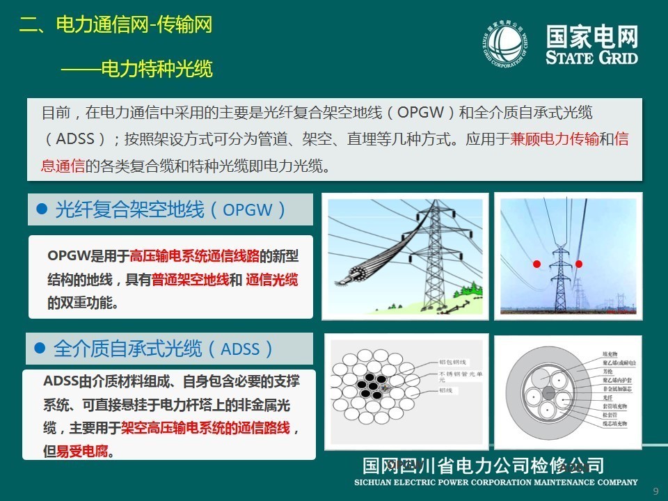 目前,在電力通信中采用的主要是光纖復(fù)合架空地線(OPGW)和全介質(zhì)自承式光纜(ADSS);按照架設(shè)方式可分為管道、架空、直埋等幾種方式。