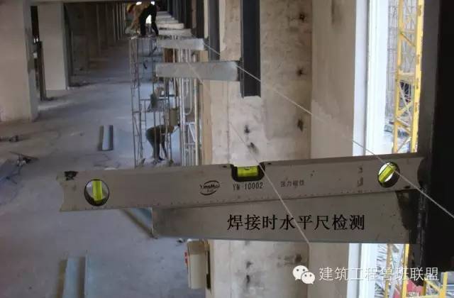 4、根據(jù)土建所給標(biāo)高,確定兩端立柱焊接位置,立柱焊接在墊板上,焊接前使用水平尺進(jìn)行檢測(cè)以保證立柱垂直度。
