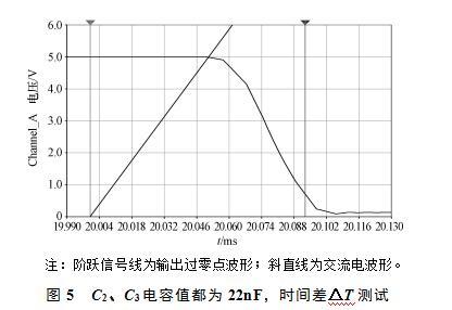 過零檢測電路輸出過零點(diǎn)信號(hào)與實(shí)際交流電的過零點(diǎn)之間時(shí)間差ΔT,如圖5所示,當(dāng)C2、C3電容值都為22nF時(shí),根據(jù)圖中所示,有