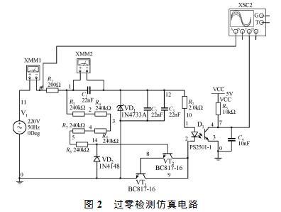 利用Multisim11.0軟件,搭建如圖2所示的仿真電路,用虛擬示波器觀測220VAC,經(jīng)光耦D1隔離后輸出的過零信號(hào)、光耦D1波形。