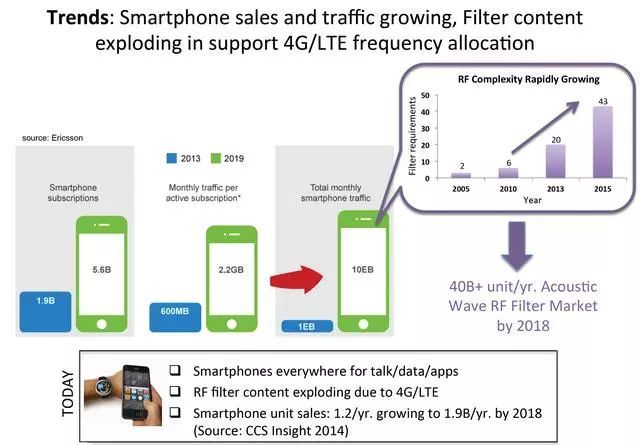 她還指出,在4G中,“我們使用每頻段20 MHz信號帶寬的載波聚合(carrier aggregation),并且使用了多個頻段。因此,我們需要先進(jìn)的高端濾波器技術(shù)(陡峭的抑制曲線)來區(qū)分每個頻段中的每個信號。而今天只有BAW(FBAR)器件技術(shù)(MEMS技術(shù))能夠滿足這種要求。“