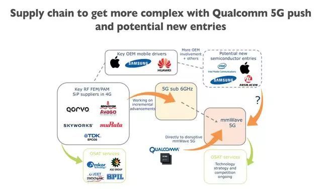 一旦行業(yè)轉(zhuǎn)向使用CMOS或者SOI技術(shù)來在SoC中設(shè)計5G mmWave(毫米波)射頻前端模塊,目前的射頻前端器件領(lǐng)域?qū)目此剖孢m的RF前端模塊供應(yīng)商俱樂部(如Broadcom,Murata,Qorvo,Skyworks,以及TDK /高通)將會發(fā)生變化。
