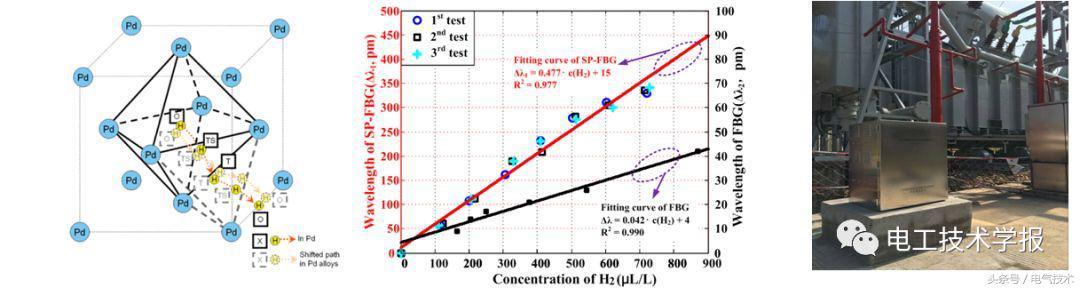 研究成果1:提出并研制了光纖光柵油中溶解氫氣傳感器,可以直接放入油中,不需要載氣標(biāo)氣,響應(yīng)時間短。傳統(tǒng)FBG氫氣傳感器遲滯較大,采用磁控濺射和金屬摻雜方法制備傳感器,消除了傳感器遲滯。