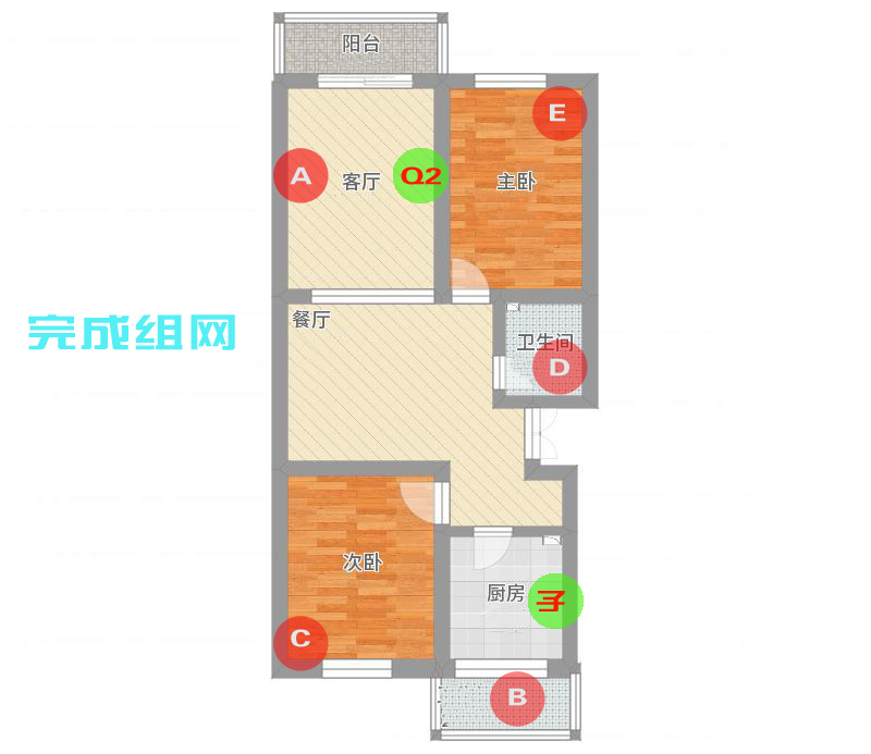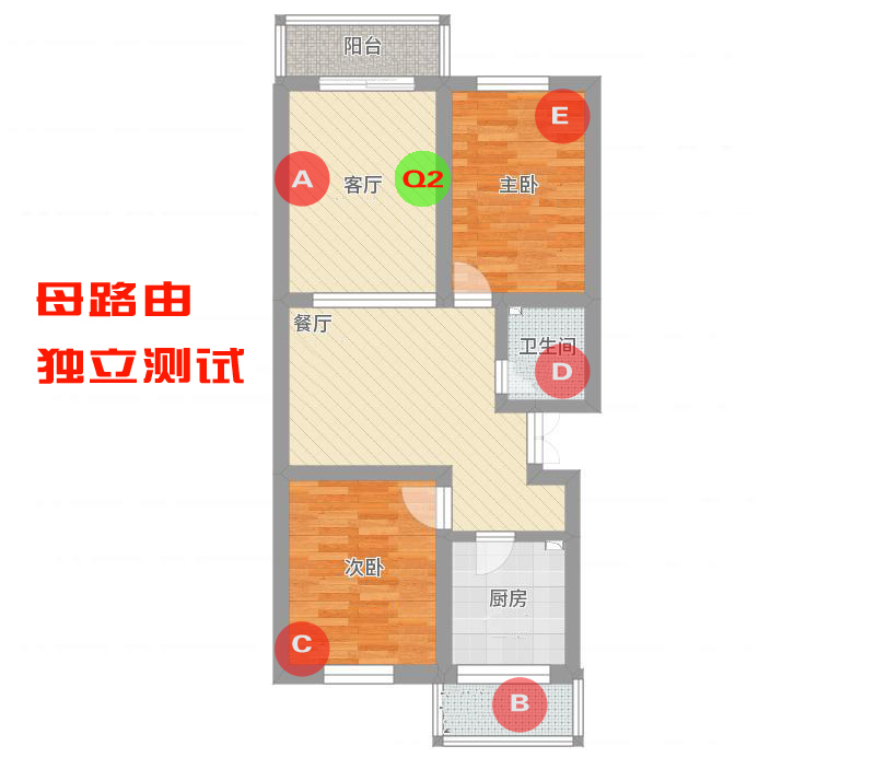 燕山派所住房屋為南北通透90平米小兩居,格局較為狹長,接入寬帶為移動100M光纖(辦手機套餐送的兩年寬帶)。將華為路由Q2母路由放在客廳電視柜上,在客廳沙發(fā)(A)、廚房陽臺(B)、次臥對角(C)、衛(wèi)生間(D)、主臥對角(E)5點,分別進行測試。