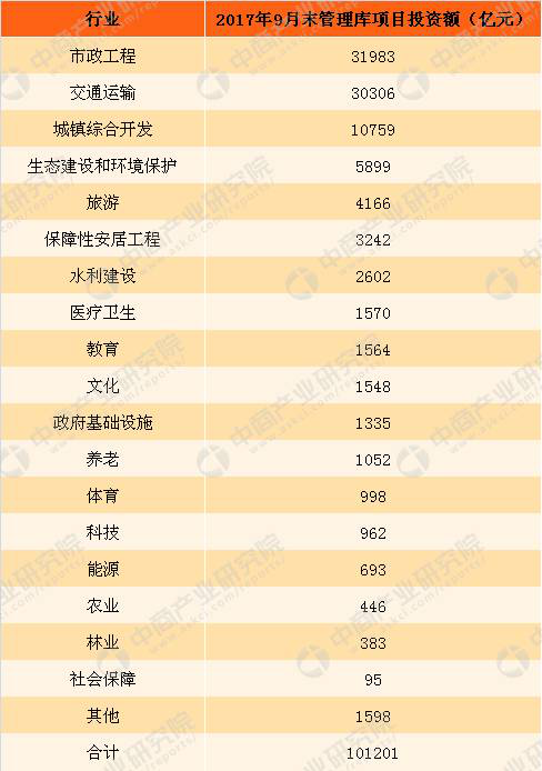 截至2017年9月末,中國各行業(yè)PPP管理庫項目投資額達(dá)到10.1萬億元。市政工程、交通運輸、城鎮(zhèn)綜合開發(fā)項目投資額居前三位,分別為31983億元、30306億元和10759億元,合計占同口徑全國總投資額的72.2%。