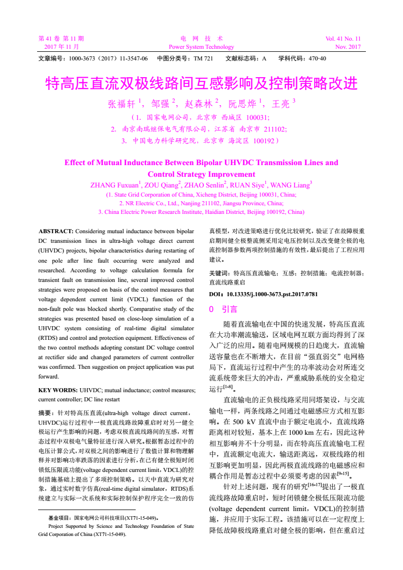 關(guān)鍵詞:特高壓直流輸電;互感;控制措施;電流控制器;直流線路重啟