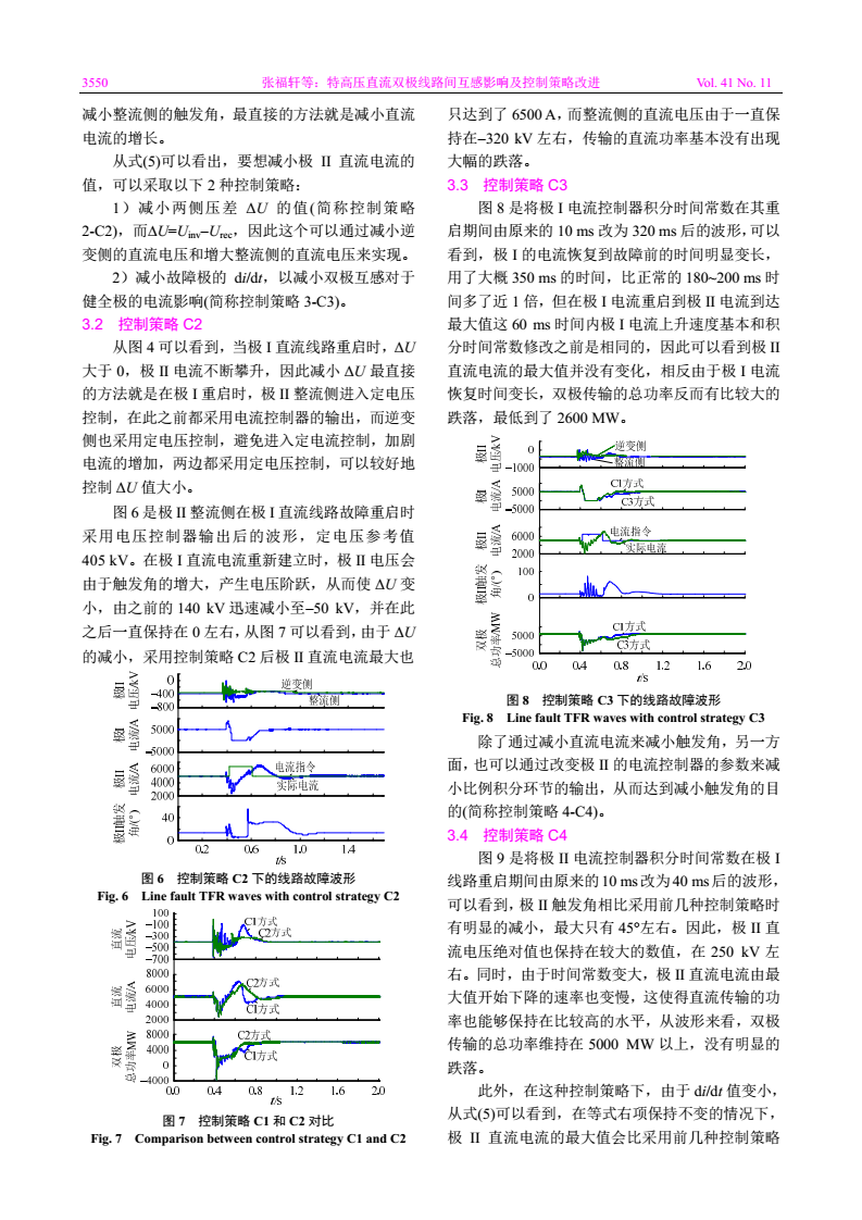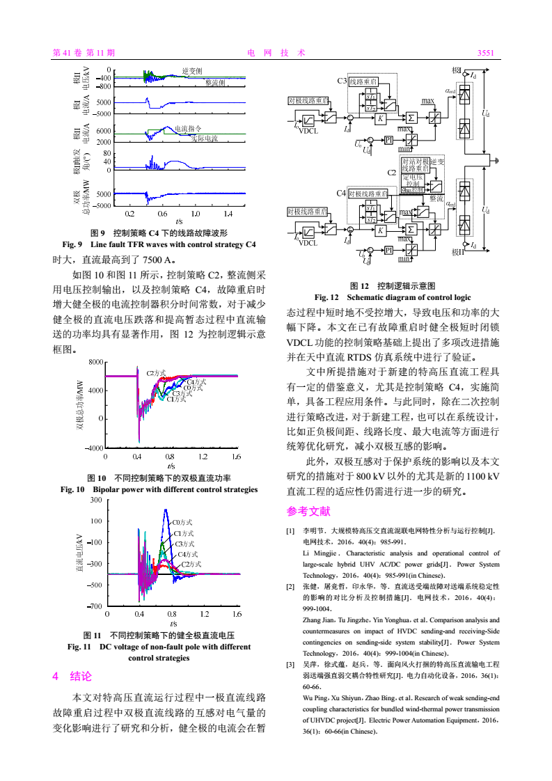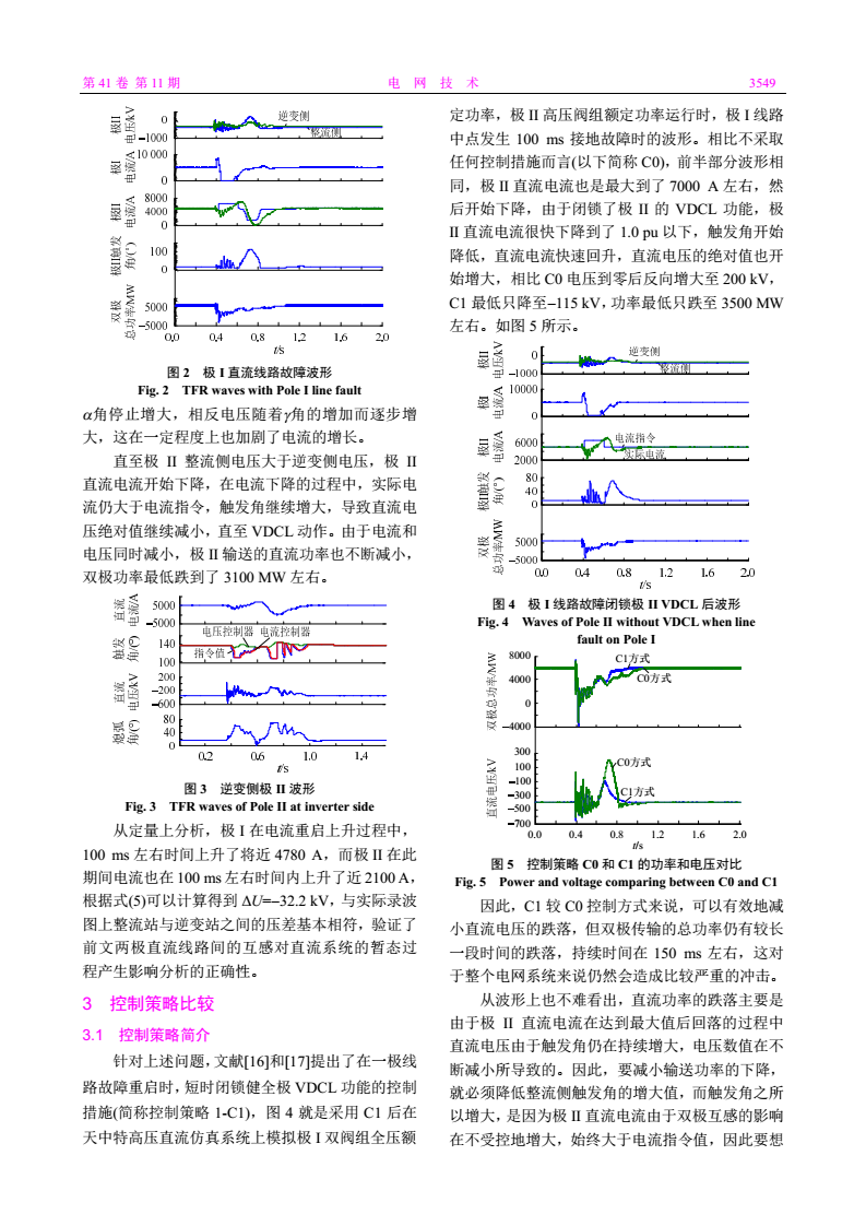 摘要:針對特高壓直流(ultra-high voltage direct current,UHVDC)運行過程中一極直流線路故障重啟時對另一健全極運行產(chǎn)生影響的問題,考慮雙極直流線路間的互感,對暫態(tài)過程中雙極電氣量特征進行深入研究。根據(jù)暫態(tài)過程中的電壓計算公式,對雙極之間的影響進行了數(shù)值計算和物理解釋并對影響功率跌落的因素進行分析,在已有健全極短時閉鎖低壓限流功能(voltage dependent current limit,VDCL)的控制措施基礎(chǔ)上提出了多項控制策略。以天中直流為研究對象,通過實時數(shù)字仿真(real-time digital simulator,RTDS)系統(tǒng)建立與實際一次系統(tǒng)和實際控制保護程序完全一致的仿真模型,對改進策略進行優(yōu)化比較研究,驗證了在故障極重啟期間健全極整流側(cè)采用定電壓控制以及改變健全極的電流控制器參數(shù)兩項控制措施的有效性,最后提出了工程應(yīng)用建議。