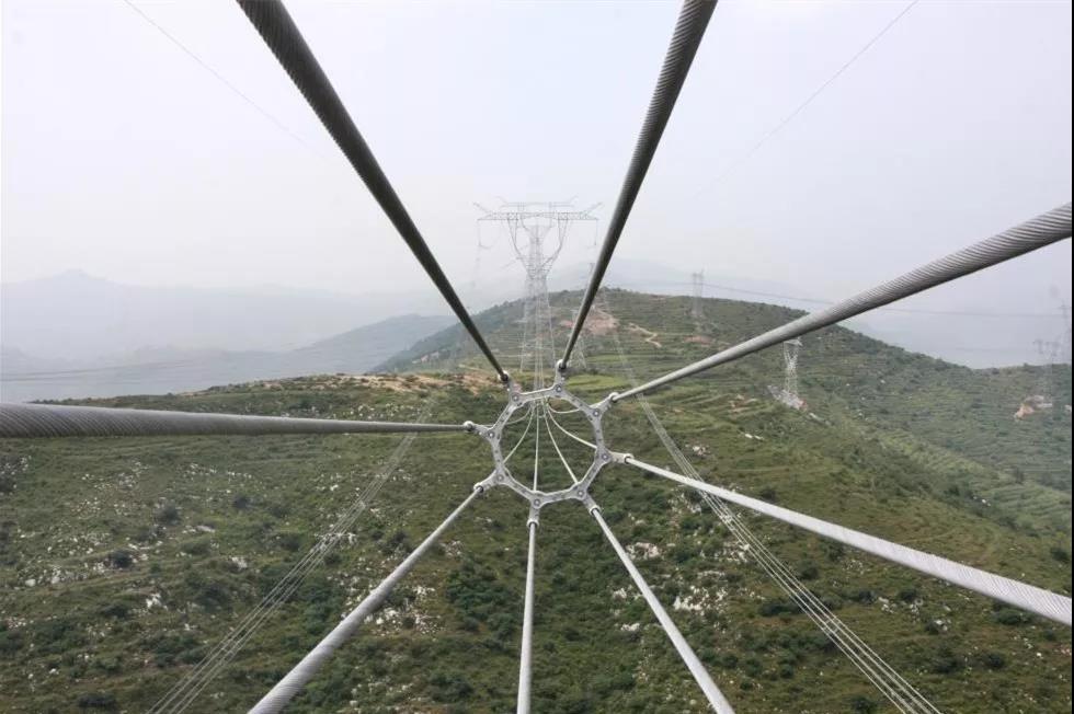 先說(shuō)分裂數(shù),正如下面這張圖片顯示的,對(duì)于ABC三相中的每一相導(dǎo)線,都是分成好幾股的,比如下面這個(gè)1000kV特高壓輸電線路就分了8股,叫“八分裂”導(dǎo)線。之所以一相導(dǎo)線要分裂成好幾股,是要把導(dǎo)線的“等效直徑”擴(kuò)大,相當(dāng)于用幾股較細(xì)的導(dǎo)線,圍成一個(gè)近似圓形,相當(dāng)于把整相的導(dǎo)線直徑“等效”擴(kuò)大了。