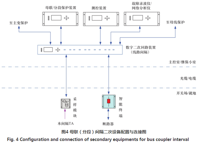 母聯(lián)(分段)間隔二次設(shè)備配置及連接與線路間隔較為相似,如圖4所示,不再詳述。