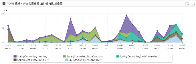 系統(tǒng)Web應(yīng)用過程分析結(jié)果如圖3、圖4所示。圖3展示了系統(tǒng)耗時排在前5的Web應(yīng)用過程,其中,SpringController/…troller/應(yīng)用過程耗時最高。圖4顯示當(dāng)月應(yīng)用吞吐率,13日—15日系統(tǒng)被頻繁調(diào)用,平均響應(yīng)時間較長。查看該應(yīng)用過程所執(zhí)行代碼,發(fā)現(xiàn)在調(diào)用“SendController.startTask”方法時耗時較多,運維人員及時進行了調(diào)優(yōu)處理。