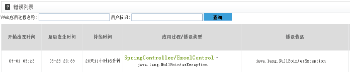 在錯誤分析模塊中,應(yīng)用錯誤率如圖7所示,該月系統(tǒng)錯誤率較低,均在0.3%以下,系統(tǒng)運行狀態(tài)良好。圖8為系統(tǒng)錯誤列表,運維人員查看具體錯誤類型及相關(guān)信息時,可獲取該錯誤的Web應(yīng)用過程、調(diào)用堆棧等信息,及時發(fā)現(xiàn)系統(tǒng)故障,并與研發(fā)人員聯(lián)系,對代碼做出相應(yīng)優(yōu)化。