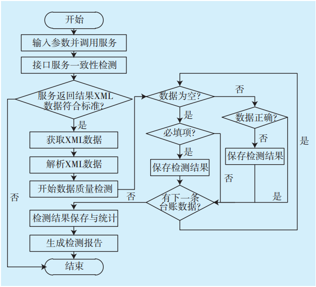 系統(tǒng)主要功能是臺(tái)賬的數(shù)據(jù)質(zhì)量檢測(cè),首先選擇待測(cè)臺(tái)賬數(shù)據(jù)類型,輸入Web訪問地址,點(diǎn)擊開始檢測(cè)后由按鈕響應(yīng)獲取用戶輸入的數(shù)據(jù),調(diào)用獲取所有臺(tái)賬ID接口,再用返回的ID數(shù)據(jù)調(diào)用待測(cè)臺(tái)賬數(shù)據(jù),判斷是否符合標(biāo)準(zhǔn)格式。然后將XML格式數(shù)據(jù)轉(zhuǎn)為SimpleXML對(duì)象,實(shí)現(xiàn)對(duì)臺(tái)賬數(shù)據(jù)的解析。質(zhì)量檢測(cè)時(shí)先判斷是否為空,如果為空,且是必填項(xiàng)保存為缺失數(shù)據(jù),若不是必填項(xiàng)檢查下一條;如果不為空,判斷是否填寫正確。檢查下一條臺(tái)賬數(shù)據(jù)直到檢測(cè)完所有的臺(tái)賬數(shù)據(jù),保存檢測(cè)結(jié)果,對(duì)結(jié)果進(jìn)行統(tǒng)計(jì)匯總生成檢測(cè)報(bào)表。系統(tǒng)流程如圖3所示。