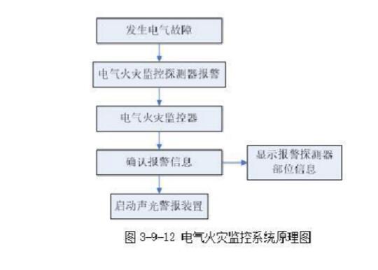 四、系統(tǒng)工作原理發(fā)生電氣故障時(shí),電氣火災(zāi)監(jiān)控探測器將保護(hù)線路中的剩余電流、溫度等電氣故障參數(shù)信息轉(zhuǎn)變?yōu)殡娦盘?,?jīng)數(shù)據(jù)處理后,探測器做出報(bào)警判斷,將報(bào)警信息傳輸?shù)诫姎饣馂?zāi)監(jiān)控器。電氣火災(zāi)監(jiān)控器在接收到探測器的報(bào)警信息后,經(jīng)確認(rèn)判斷,顯示電氣故障報(bào)警探測器的部位信息,記錄探測器報(bào)警的時(shí)間,同時(shí)驅(qū)動(dòng)安裝在保護(hù)區(qū)域現(xiàn)場的聲光警報(bào)裝置,發(fā)出聲光警報(bào),警示人員采取相應(yīng)的處置措施,排除電氣故障、消除電氣火災(zāi)隱患,防止電氣火災(zāi)的發(fā)生。電氣火災(zāi)監(jiān)控系統(tǒng)的工作原理如圖3-9-12所示。