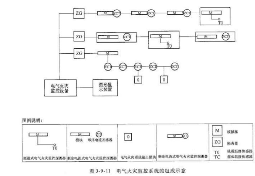 電氣火災(zāi)監(jiān)控系統(tǒng)是火災(zāi)自動(dòng)報(bào)警系統(tǒng)的獨(dú)立子系統(tǒng),屬于火災(zāi)預(yù)警系統(tǒng)。電氣火災(zāi)監(jiān)控系統(tǒng)的組成示意圖如圖3-9-11所示。