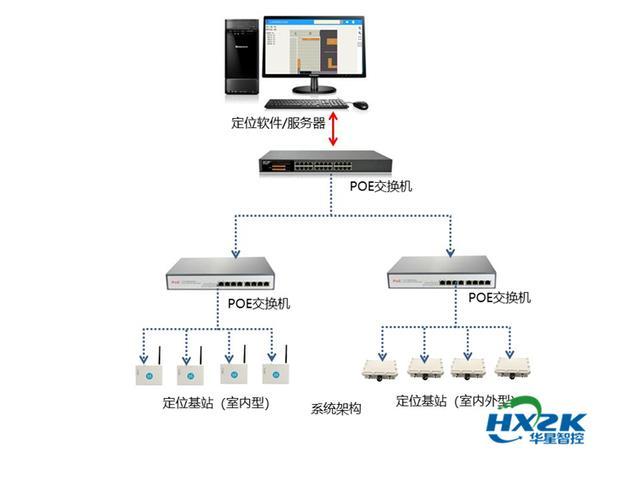 如下圖是一種典型的有線傳輸架構,定位基站通過POE交換機供電和數(shù)據(jù)傳輸,將傳輸和供電合二為一。