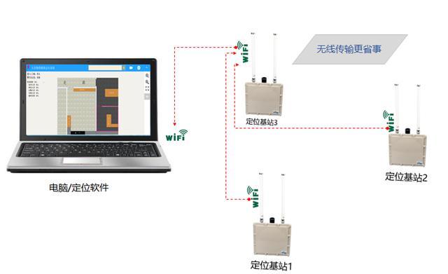 如下圖是一種典型的無線傳輸架構,通過定位基站自帶的Wifi將數(shù)據(jù)傳輸?shù)诫娔X軟件就可以完定位,這種模式省去了網(wǎng)線/光纜的安裝架設,只需要給基站供電就可以實現(xiàn),這種模式需選用帶Wifi功能的定位基站。
