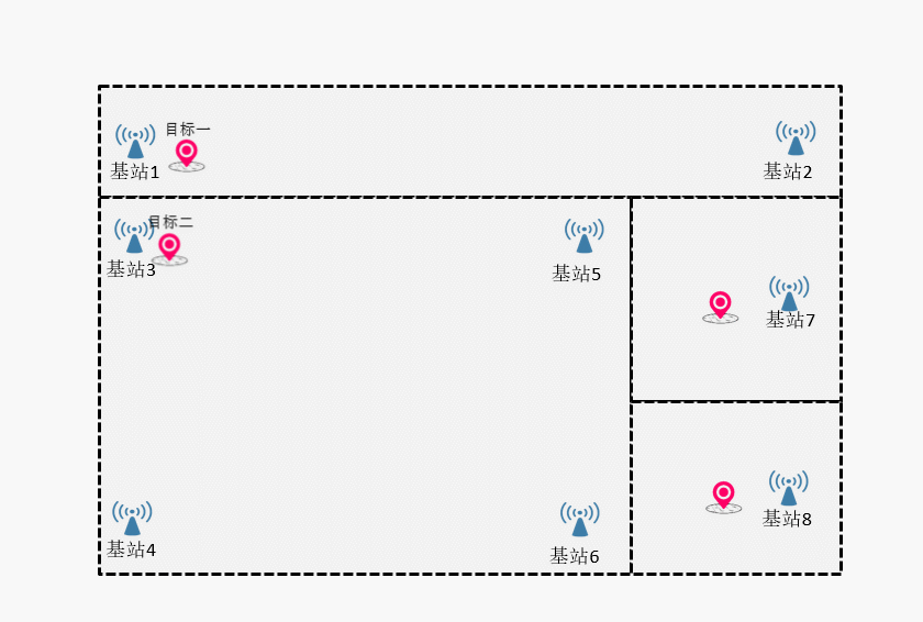 2:大區(qū)域通過基站3、4、5、6四個基站我們可以實現(xiàn)精確的2維定位;