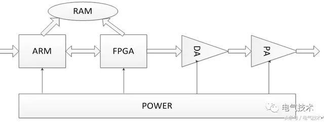 電能質(zhì)量標(biāo)準(zhǔn)源主要有控制模塊、隨機(jī)存儲器RAM、模數(shù)轉(zhuǎn)化部分DA、功率放大器PA等幾部分組成,如圖2所示