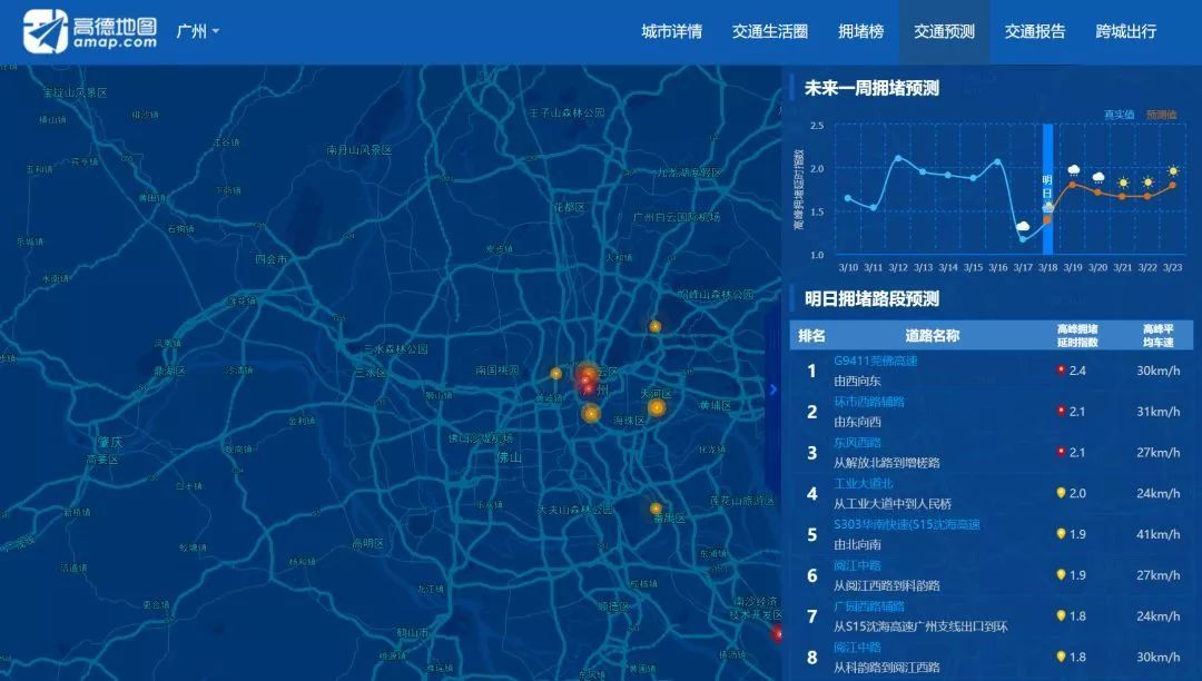 4)交通預(yù)測,通過高德地圖交通大數(shù)據(jù),我們可以輕松從網(wǎng)站上面,查出我國主要城市未來一周的交通預(yù)測情況,例如選擇廣州市,廣州市未來一周的交通情況,即可通過下圖進行了解。