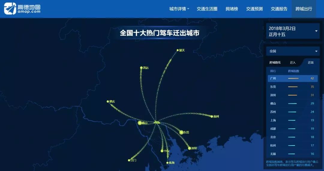 6)跨城出行,通過高德地圖交通大數(shù)據(jù),我們可以輕松從網(wǎng)站上面,查看到某兩個城市之間,遷入、遷出的情況,例如選擇遷出為廣州,得到的數(shù)據(jù)如下圖所示: