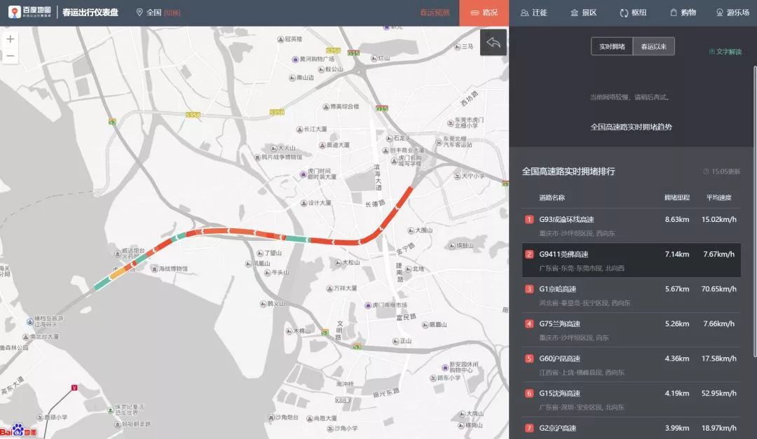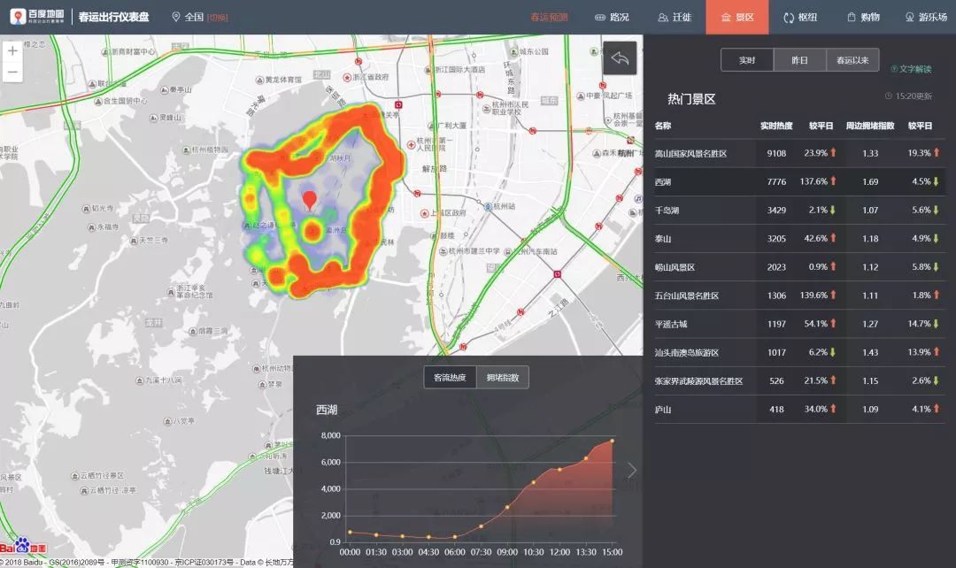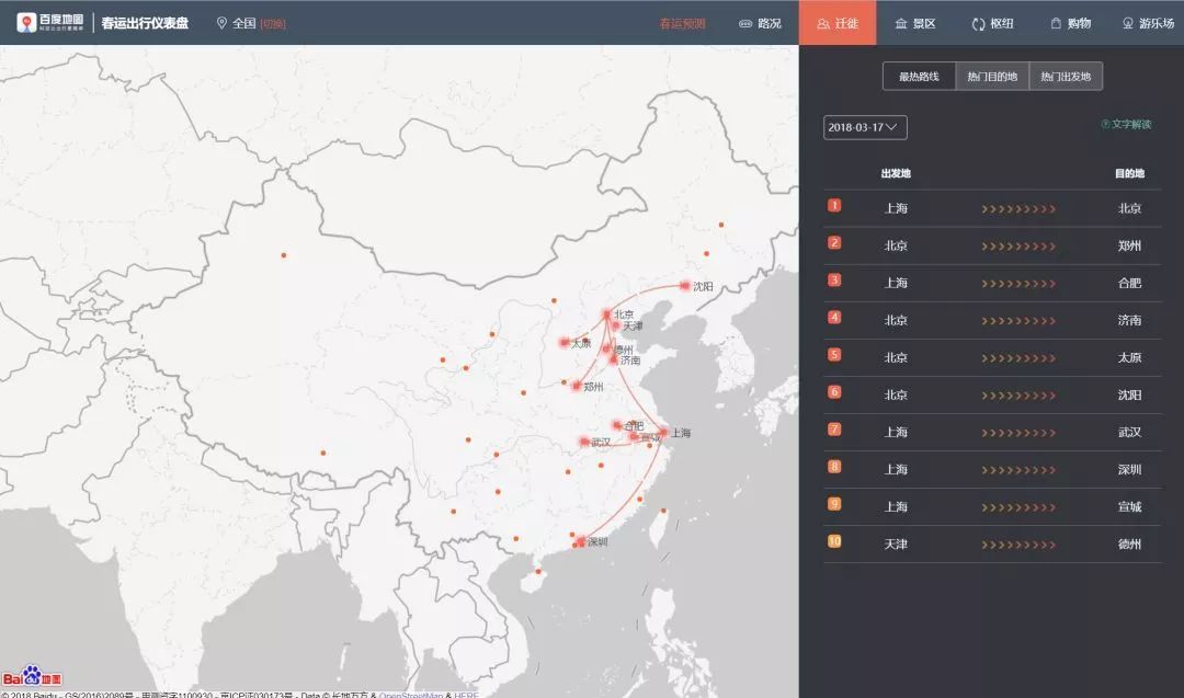 百度基于百度地圖做的百度遷徙地圖,可以獲取到路況、遷徙、景區(qū)、樞紐、購物以及游樂場的實時數(shù)據(jù)。