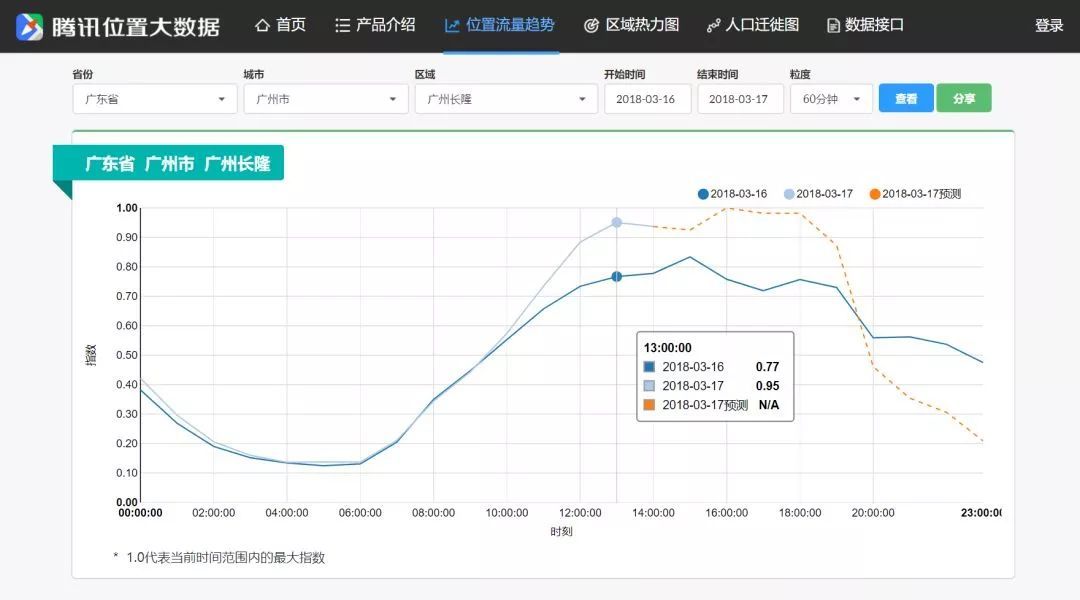 1)位置流量趨勢,通過騰訊位置大數(shù)據(jù),可以得到一個地區(qū),例如下圖廣東省廣州市廣州長隆區(qū)域的位置流量信息,可以看到,除了提供歷史的流量數(shù)據(jù),騰訊位置大數(shù)據(jù)還提供了一天接下來的時間段的預(yù)測數(shù)據(jù),可以通過預(yù)測數(shù)據(jù),避免高峰出行。